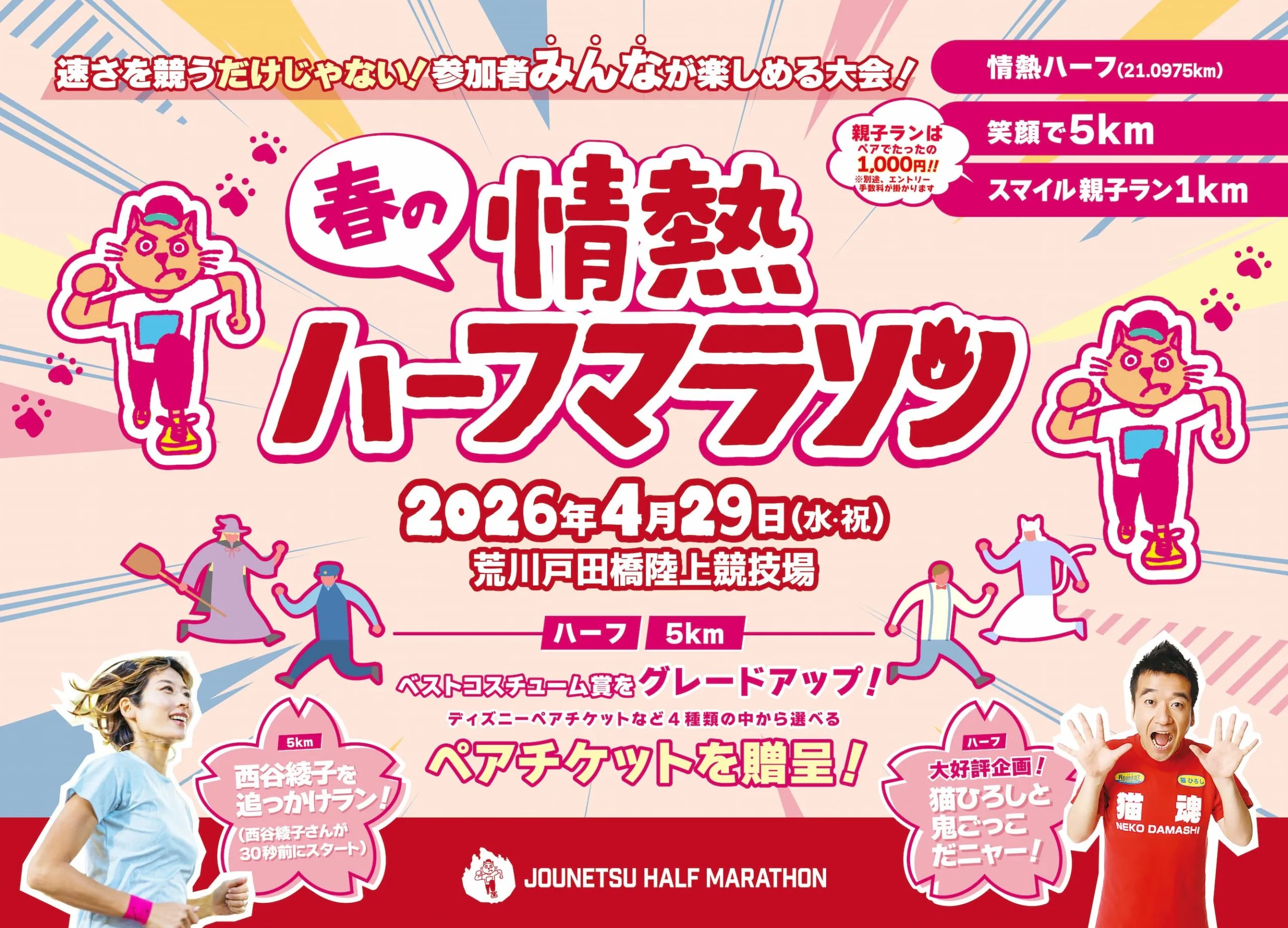 NEWS大会事務局よりお知らせ GWの営業のお知らせ 2026年4月8日 / お知らせベストコスチューム賞の景品と当日の申込方法について! 2026年3月19日 / お知らせ春の情熱ハーフマラソン2026エントリー開始! 2025年12月9日 / お知らせ 一覧はこちら ピックアップPick Up icon-arrow-right ゲストゲストランナーに猫ひろしさん&西谷綾子さん! icon-arrow-right 特別企画!速さだけじゃない!参加者みんなで楽しめる企画が盛りだくさんです! icon-arrow-right ペーサー7つのペーサーの中から自分にあったペーサーを選んで走っていただくことが可能です!大会の様子Photo Gallery Facebook情熱ハーフマラソン Instagram athlete_smile🏃9/23 情熱ハーフマラソン2025 🏃♀️9/28 TOYOSUランフェスautumn2025 ↓↓イベント開催、お問合せはHPより⭐️↓↓ . \TOKYO EAST RUN 30K/今年も「TOKYO EAST RUN30K」開催決定 . \\TOYOSUランフェス2026// 絶賛エントリー受付中です🏃♂️🏃♀️豊洲の海沿い . 「春の」情熱ハーフマラソンが 本日12月8日よりエントリー開始!🏃♂️🏃♀️ゲストランナ . TOYOSUランフェスautumn2025 本日開催いたします!!水分補給をしっかり行なって . \情熱ハーフマラソンへご参加いただいた皆さま 誠にありがとうございました/9月2 . 情熱ハーフマラソン2025 本日開催いたします!!走りやすい気候になりそうですね✨ 水分補給 . \締切間近!TOYOSUランフェスautumn2025🍂/海風を感じながら豊洲の街を駆け抜け . \ベストコスチューム賞の決定方法について/情熱ハーフマラソン2025にエントリーいただいた皆 . \エントリー締め切りまで残り10日💨/TOYOSUランフェスautumn2025のエントリー . \TOYOSUランフェスautumnエントリー期間延長/TOYOSUランフェスautumn2 さらに読み込む Instagram でフォロー 協賛Sponsor